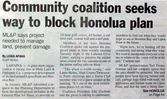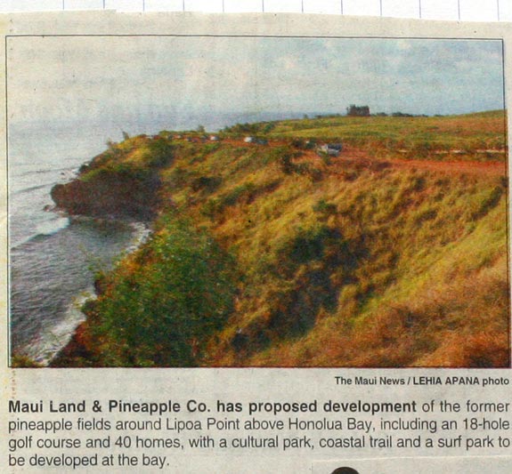 LAHAINA – A grass-roots organization is taking aim at Maui Land & Pineapple Co.’s proposed development of its land around Lipoa Point and Honolua Bay.