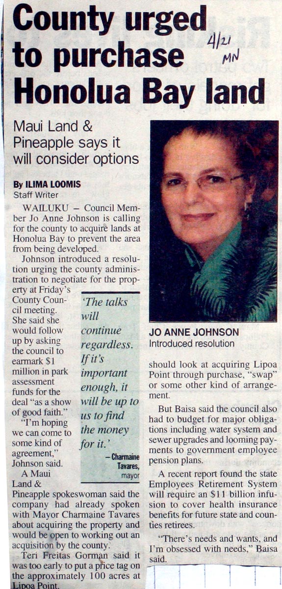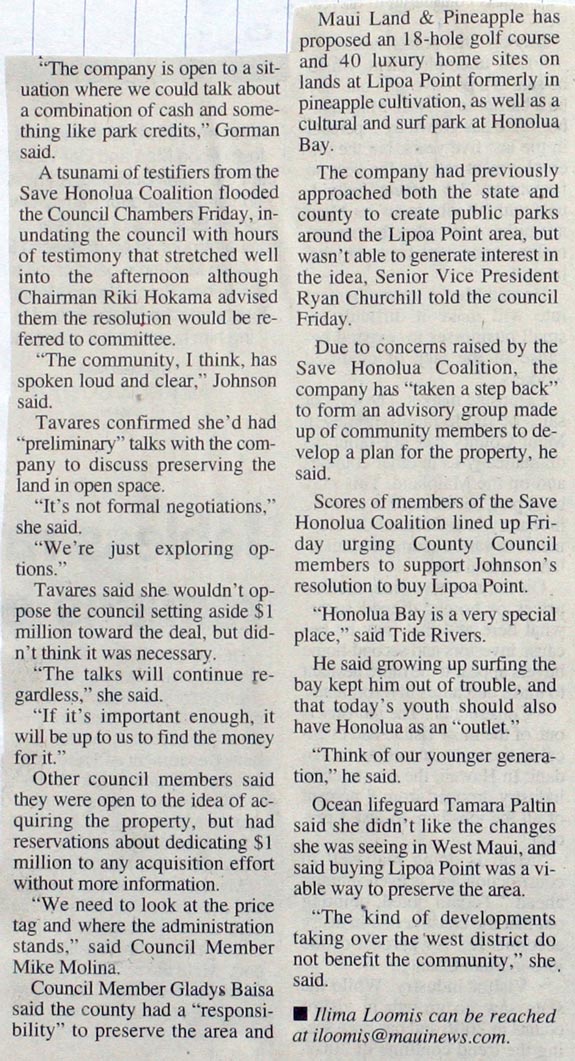 By ILIMA LOOMIS, Staff Writer WAILUKU – Council Member Jo Anne Johnson is calling for the county to acquire lands at Honolua Bay to prevent the area from being developed. Johnson introduced a resolution urging the county administration to negotiate for the property at Friday’s County Council meeting. She said she would follow up by asking the council to earmark $1 million in park assessment funds for the deal “as a show of good faith.” “I’m hoping we can come to some kind of agreement,” Johnson said. A Maui Land & Pineapple spokeswoman said the company had already spoken with Mayor Charmaine Tavares about acquiring the property and would be open to working out an acquisition by the county. Teri Freitas Gorman said it was too early to put a price tag on the approximately 100 acres at Lipoa Point. “The company is open to a situation where we could talk about a combination of cash and something like park credits,” Gorman said. A tsunami of testifiers from the Save Honolua Coalition flooded the Council Chambers Friday, inundating the council with hours of testimony that stretched well into the afternoon although Chairman Riki Hokama advised them the resolution would be referred to committee. “The community, I think, has spoken loud and clear,” Johnson said. Tavares confirmed she’d had “preliminary” talks with the company to discuss preserving the land in open space. “It’s not formal negotiations,” she said. “We’re just exploring options.” Tavares said she wouldn’t oppose the council setting aside $1 million toward the deal, but didn’t think it was necessary. “The talks will continue regardless,” she said. “If it’s important enough, it will be up to us to find the money for it.” Other council members said they were open to the idea of acquiring the property, but had reservations about dedicating $1 million to any acquisition effort without more information. “We need to look at the price tag and where the administration stands,” said Council Member Mike Molina. Council Member Gladys Baisa said the county had a “responsibility” to preserve the area and should look at acquiring Lipoa Point through purchase, “swap” or some other kind of arrangement. But Baisa said the council also had to budget for major obligations including water system and sewer upgrades and looming payments to government employee pension plans. A recent report found the state Employees Retirement System will require an $11 billion infusion to cover health insurance benefits for future state and counties retirees. “There’s needs and wants, and I’m obsessed with needs,” Baisa said. Maui Land & Pineapple has proposed an 18-hole golf course and 40 luxury home sites on lands at Lipoa Point formerly in pineapple cultivation, as well as a cultural and surf park at Honolua Bay. The company had previously approached both the state and county to create public parks around the Lipoa Point area, but wasn’t able to generate interest in the idea, Senior Vice President Ryan Churchill told the council Friday. Due to concerns raised by the Save Honolua Coalition, the company has “taken a step back” to form an advisory group made up of community members to develop a plan for the property, he said. Scores of members of the Save Honolua Coalition lined up Friday urging County Council members to support Johnson’s resolution to buy Lipoa Point. “Honolua Bay is a very special place,” said Tide Rivers. He said growing up surfing the bay kept him out of trouble, and that today’s youth should also have Honolua as an “outlet.” “Think of our younger generation,” he said. Ocean lifeguard Tamara Paltin said she didn’t like the changes she was seeing in West Maui, and said buying Lipoa Point was a viable way to preserve the area. “The kind of developments taking over the west district do not benefit the community,” she said. Ilima Loomis can be reached at iloomis@mauinews.com.